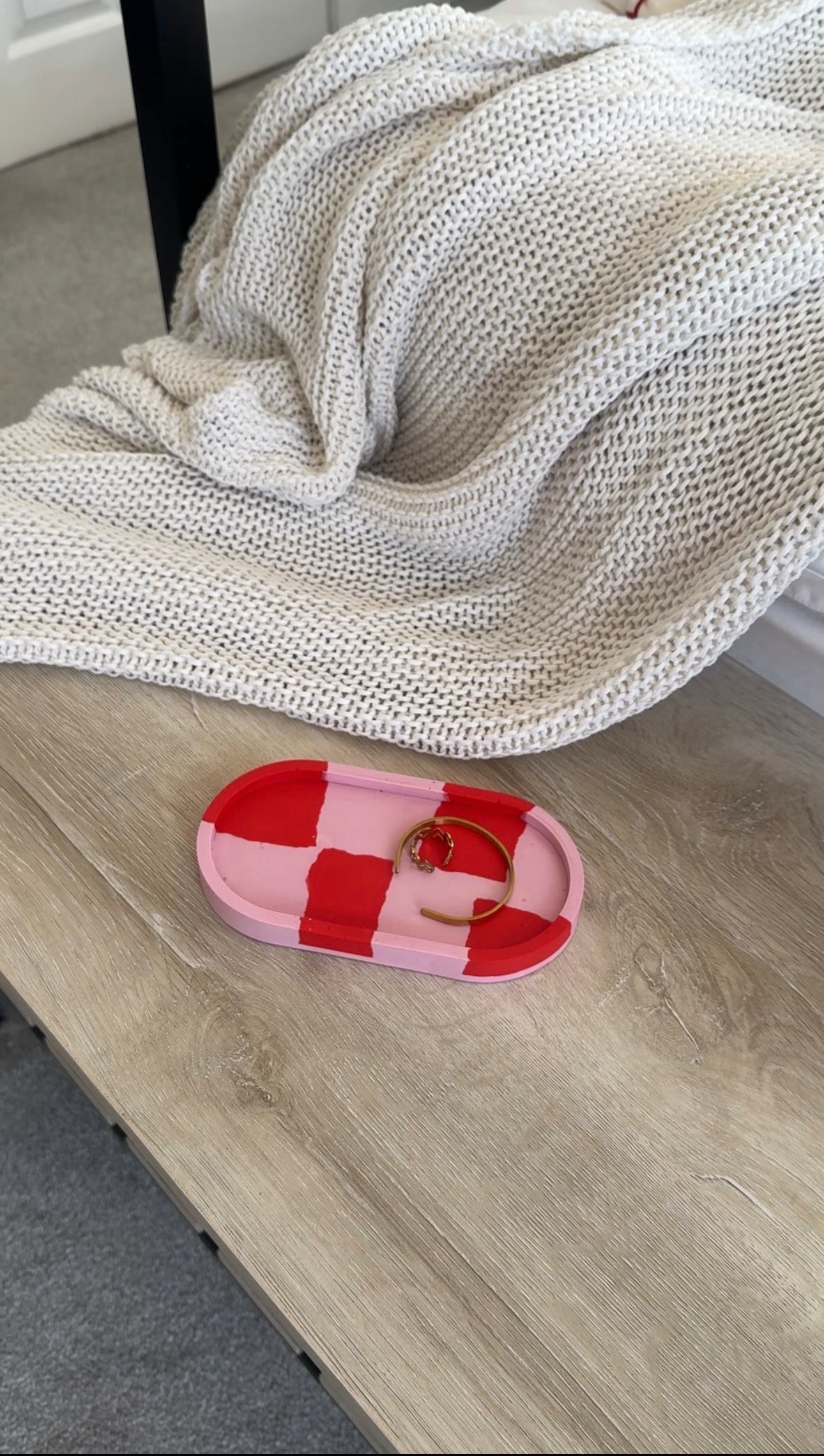 A bold yet playful jewellery tray designed to keep your everyday pieces in one place. Handmade with a soft pink base and striking red checkerboard detail, this tray is perfect for rings, bracelets and small accessories. Compact and practical, it sits beautifully on bedside tables, dressing tables or shelves while adding a pop of colour to your space.